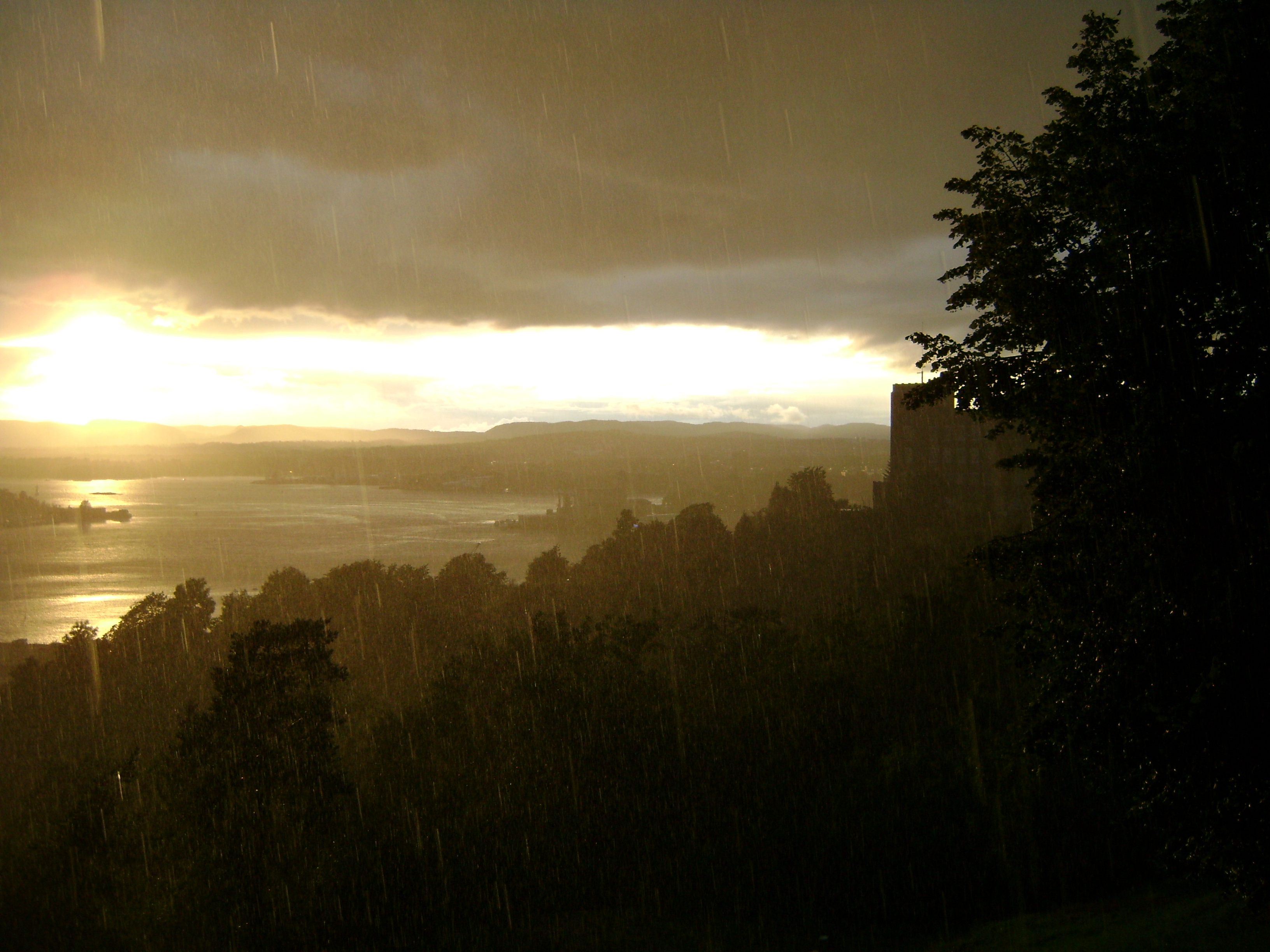 After passing the 3 hour mark, I still had a little ways to go, but I had made it to Nordstrand, which was a community or suburb south of Oslo. Finally! I felt like I was almost there, whether or not I actually was. I stopped to consult my handy map, found my location, and began to determine the most direct way from where I was to get to the city. A flash of lightning and instantly a clap of thunder – the skies then opened up. Thank goodness I had my raincoat! I threw on my rain coat, which I have had ever since I worked as a dock hand at the Wentworth-by-the-Sea Marina in New Castle, NH. Trusty little jacket…