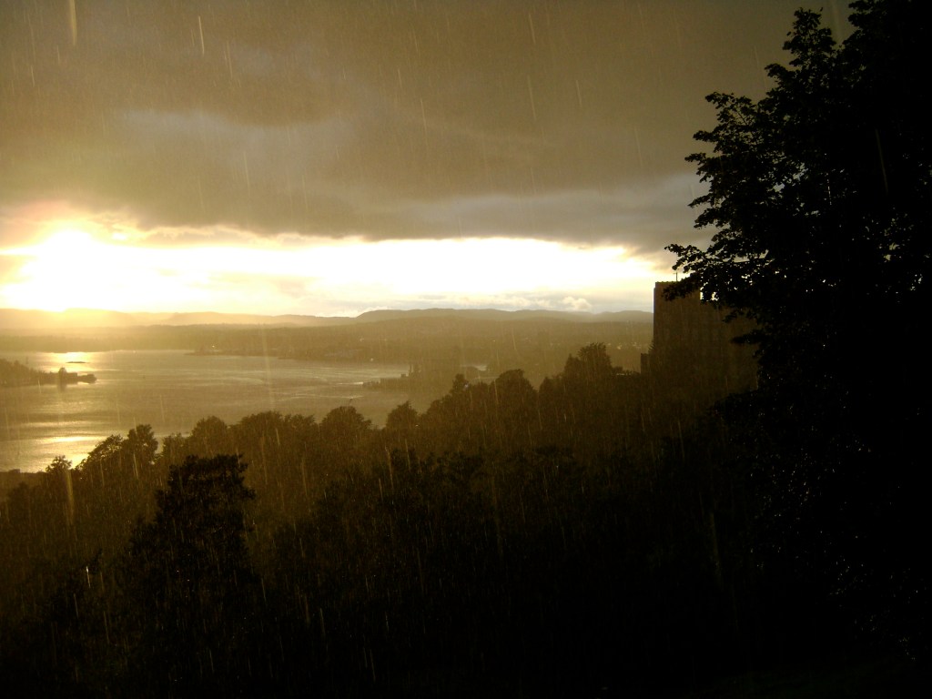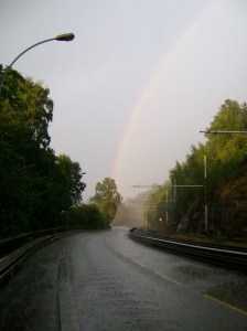 Almost to the city, there was a break in the tree line where I could see from my perch above the Oslofjord an absolutely gorgeous view of the sun breaking through the clouds and the rain. This and the rainbow that followed were a perfect way to end my ride towards the train station where I was meeting a friend. I did not mind anymore the long, exhausting ride, or the torrential downpour, or the hail, or the cold hands or soaking wet body (turns out the rain coat was not effective enough…)…